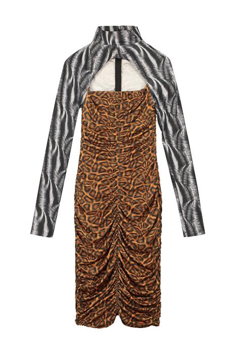 This slinky dress comes in a vibrant clashing animal print. Seemingly made of two separates – a jaguar print dress with rouched pleating at the front and a zebra print funnel neck top – the feminine silhouette is accented with a cut-out detailing at the chest. The perfect statement dress that's sure to bag you that 'best dressed guest' award.