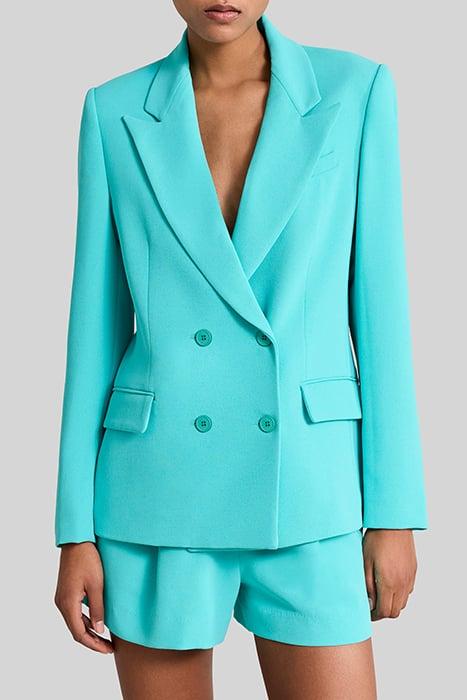 The Summer Suit Is A Big Trend Right Now. This Jacket In Bright Azure Blue, Which Is Similar To Turquoise, Shows Off An Exclusive Striped Lining.