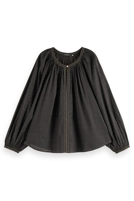 Elevate your evening look with this stunning Balloon Sleeve Embroidered Top from Scotch & Soda. Made from a luxurious black fabric, this top features delicate polka dot embroidery that adds a touch of elegance to the piece. The statement balloon sleeves create a dramatic silhouette, perfect for special occasions or a night out. Pair this top with tailored pants or a skirt for a sophisticated and chic ensemble. Make a stylish statement with this timeless and versatile piece from Scotch & Soda.