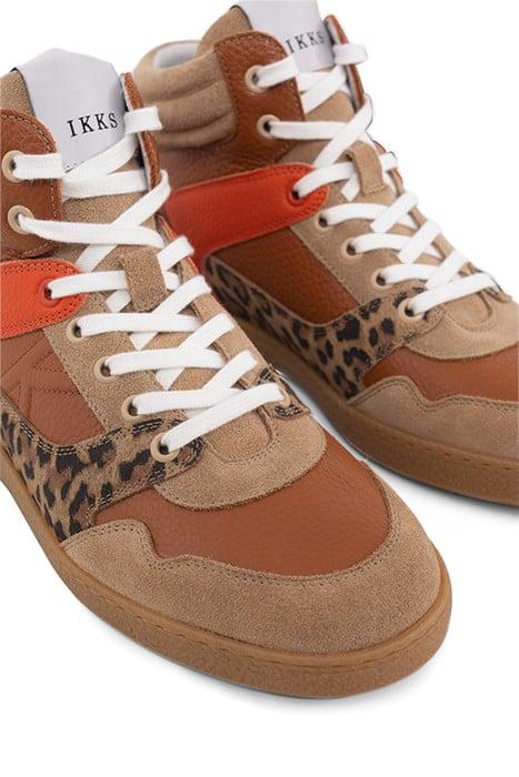 BEIGE, ORANGE AND LEOPARD LEATHER MIX TRAINERS