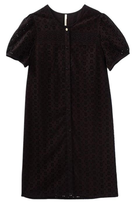 Black Straight Dress Round Neck, Short Balloon Sleeves Eyelet Embroidery, Tone-On-Tone Lining Front Button Fastening, 1 Signature Ic Button Dress Length: 88 Cm