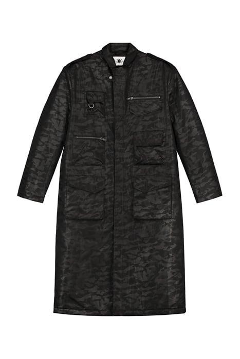 A piece of heritage outerwear reengineered with modern fabrics, this long military-inspired coat comes features epaulettes and several different pockets and is crafted from a contemporary DPM camouflage patterned fabric. Cut from a synthetic woven with a stiff reflective yarn, the fabric has a technical look and feel. Comes with a hidden placket snap button closure, stand up collar with throat latch and monogram lining.