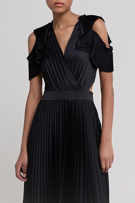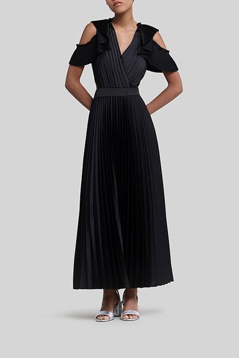 BLACK RECYCLED PLEATED LONG DRESS, SIDE CUT-OUTS