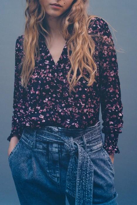 BLACK SHEER BLOUSE WITH PINK VELVET PRINT