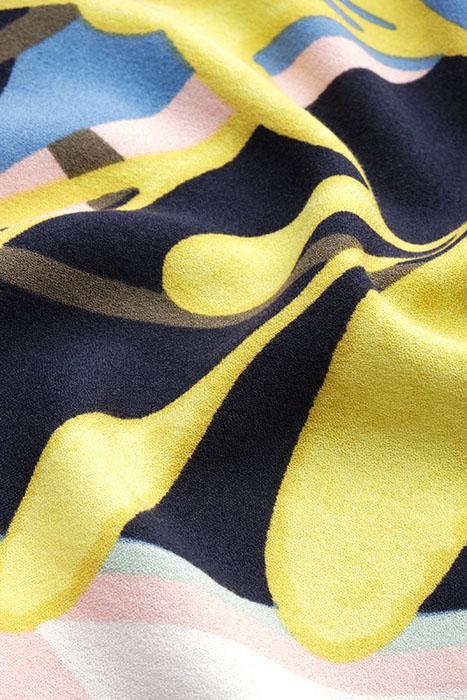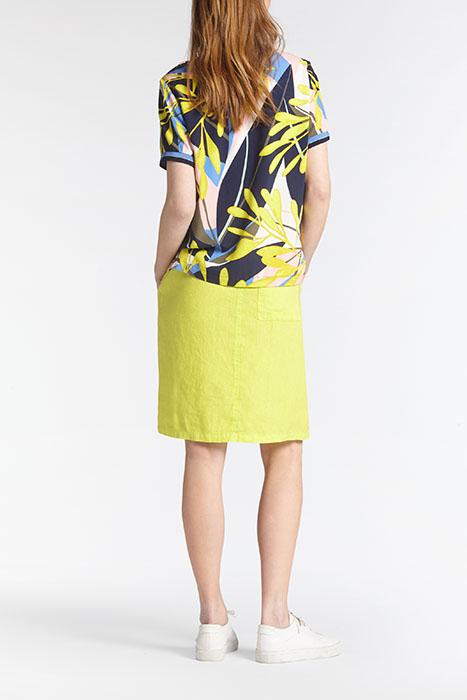 Dit T-shirt is bedrukt met een prachtige, meerkleurige all-over print. Het shirt heeft een ronde hals en een elastische gestreepte lurex bies op de mouwen.