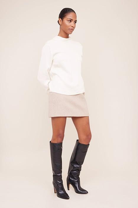 Feel stylish in this fantastic top. This new style has a soft turtleneck that flows into an elegant exposed back. The sleeves have a relaxed fit and a seam creating a rounded shape. A button at the bottom can be closed to create an elegant pleat at the reverse of the sleeve.