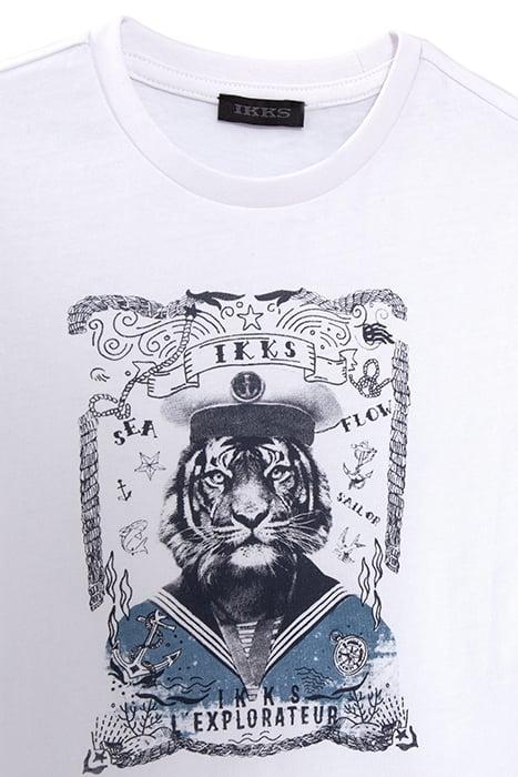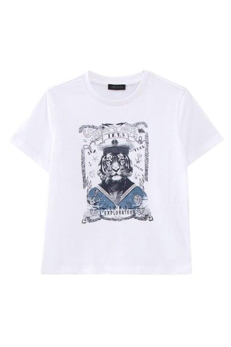 BOYS' WHITE ORGANIC COTTON T-SHIRT WITH TIGER-SAILOR IMAGE