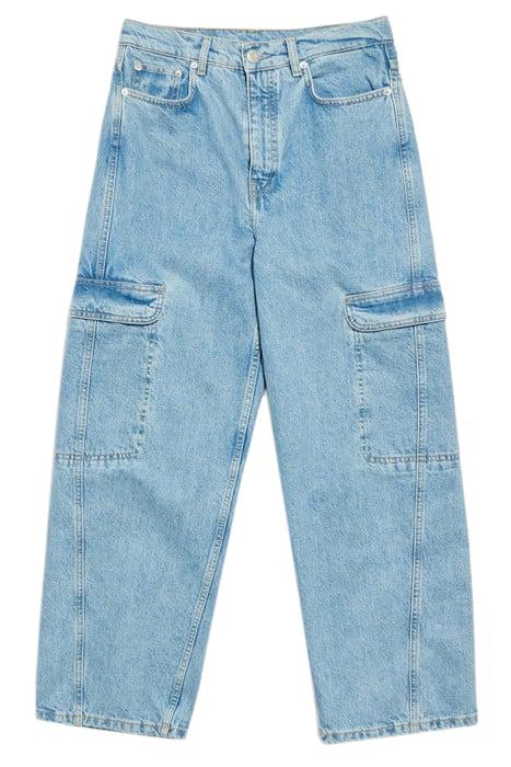 Cargo Style Jeans In Blue. Mid-Rise With Front Metal Button And Zip Fastener. Side Flap Pockets.