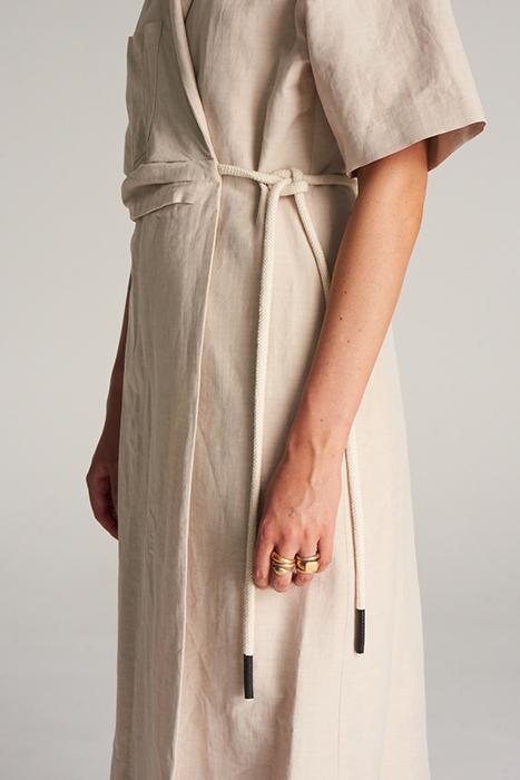 Frenken Cordage Dress In Beige Brings A Combination Of Comfort And Elegance. It Fits Just Below The Knee, With Dropped Sleeves, Small V-Neck Line, And With A Drawstring All Around The Waist, In Order To Adjust The Dress To Your Taste.