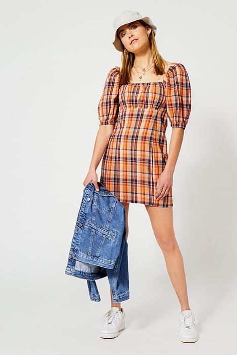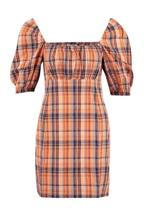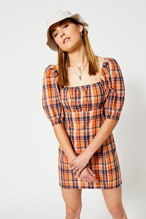 America Today Dress For Women. This Summery Dora Dress Has An All-Over Plaid Print And A Cheerful Color. The Dress Has Puff Sleeves And Is Made Of A Nice Airy Cotton Fabric That Falls Around The Body. This Dress Is Perfect For The Warm Summer Days.
