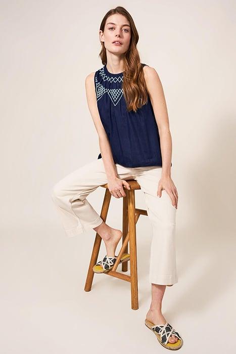 Add a touch of effortless charm to your ensemble with the Esme Cotton Silk Vest Navy, tailored for a seamless fit and sleek design.