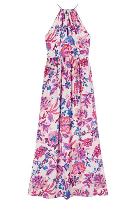 Viscose Satin Long Dress, Floral Pattern, Halterneck With Keyhole Feature On The Back, Zip Opening At The Centre Back, Flared Long Skirt