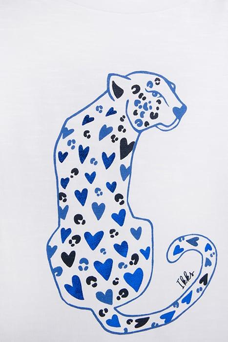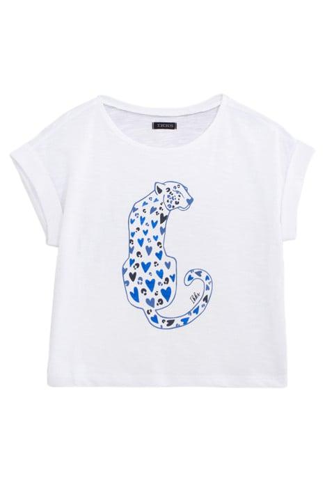 GIRLS' WHITE ORGANIC COTTON T-SHIRT, HEART LEOPARD IMAGE