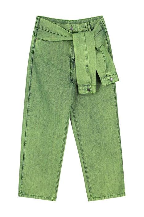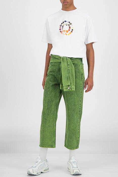 A subversive and playful spin on the classic five-pocket jean silhouette, these trousers come with deconstructed detailing. Two mock denim shirt sleeves are spliced onto the pants and left suspended at the hips to create an unorthodox aesthetic, they also double up as a makeshift belt should you not want to use the twin belt loops. Using an acid washed treatment in conjunction with green garment-dyeing techniques and contrast stitching, these denims take on an almost luminous hue.