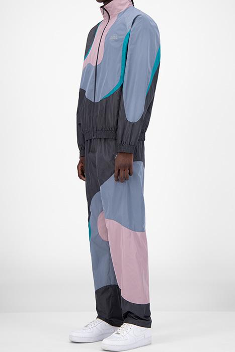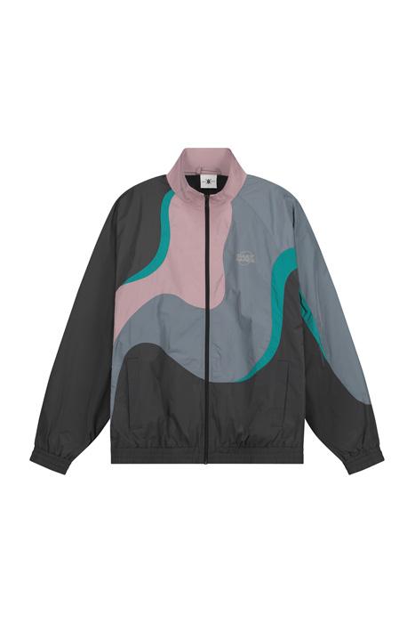 A contemporary take on a classic track top featuring asymmetric panels of grey, lilac and teal overlaid on technical black nylon. The retro graphic on the chest add to the vintage athletic sportswear look and feel. Use the removable branded rubber zip pull to wear it fully zipped up with a mesh lining for added warmth. Features a ribbed hem for a snug fit.