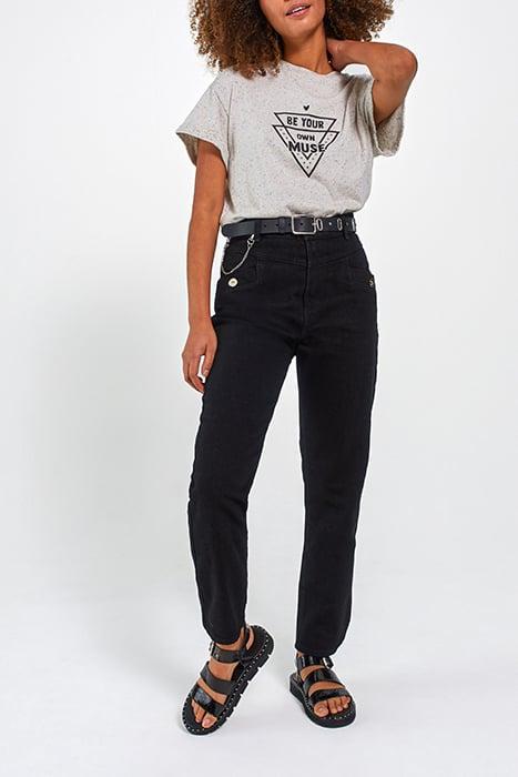 Women’s intense black slouchy jeans - 2 side pockets, 2 patch back pockets - Seams under the waistband, front and back - Zip and button fly