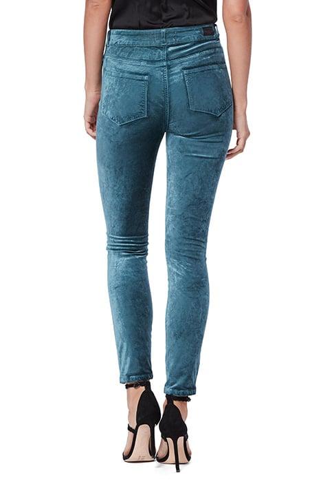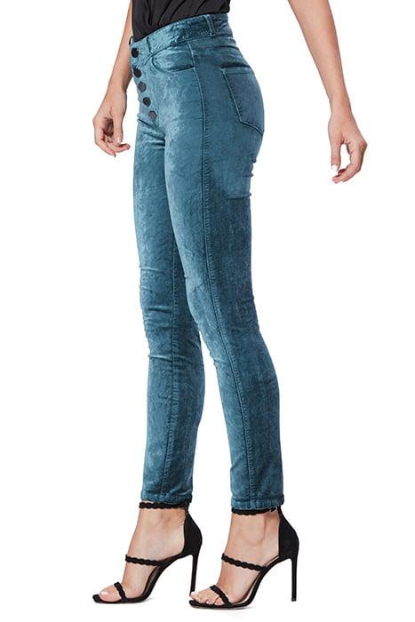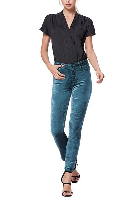 Our moody sea-blue stretch velvet fabric turns retro-inspired with an exposed button front and ultra high rise ankle silhouette. Tuck it into a T-shirt for a laid-back look or style with a silk cami for a more refined vibe.