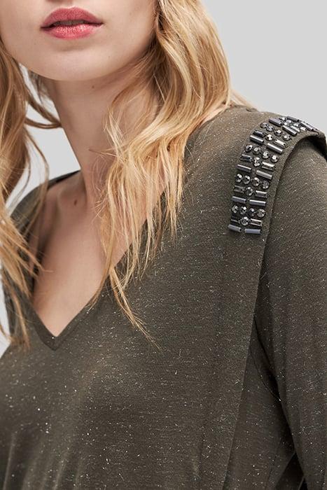 KHAKI V_NECK VISCOSE T_SHIRT WITH RHINESTONES
