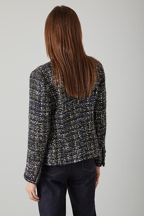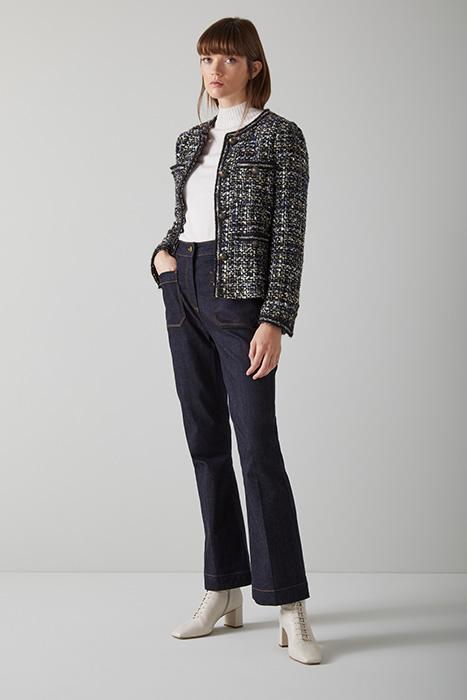 Perfectly pairing up with the matching skirt for party season, our Leena tweed jacket takes on sparkling lurex for the festive season. Crafted from beautiful black, cream and blue tweed with flecks of sparkle, it's a chic, collarless style with double patch pockets with gold buttons and it's finished with trim detail. Wear it with the Leena skirt or with a pair of jeans and a sleek knit.