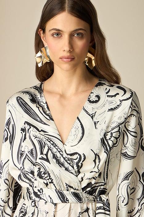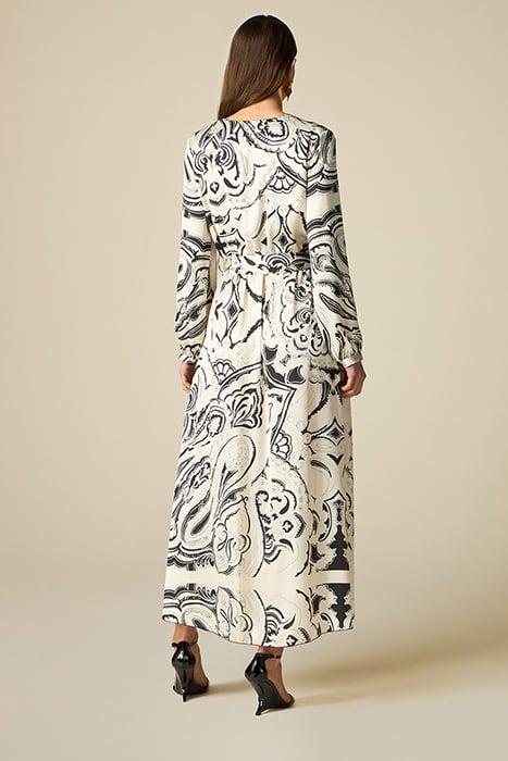 Long Flowing Satin Dress With Foulard Pattern, Top Crossover Part Creating A V-Neckline, Elasticated Stitching At The Waist And Sash To Tie In A Bow