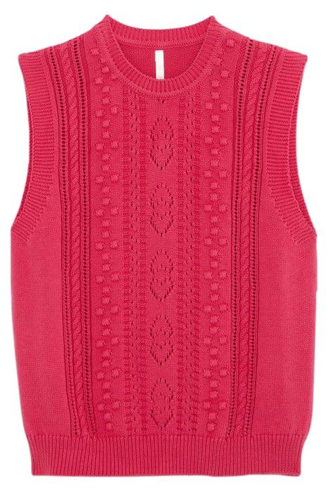 Women’S Magenta Pink Sweater Round Neck, Sleeveless Fantasy Knit, With Openwork Double Hearts 1X1 Ribbing On Neck, Shoulders And Hem
