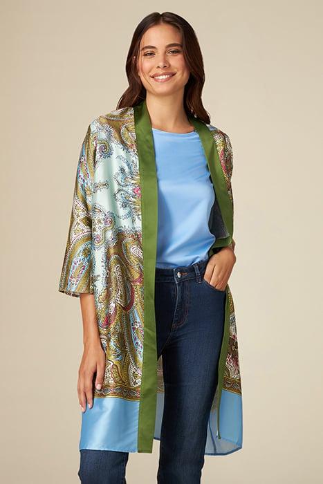 Oversized Cut Kimono,Flowing Cashmere Pattern Twill With Satin Trim On The Front
