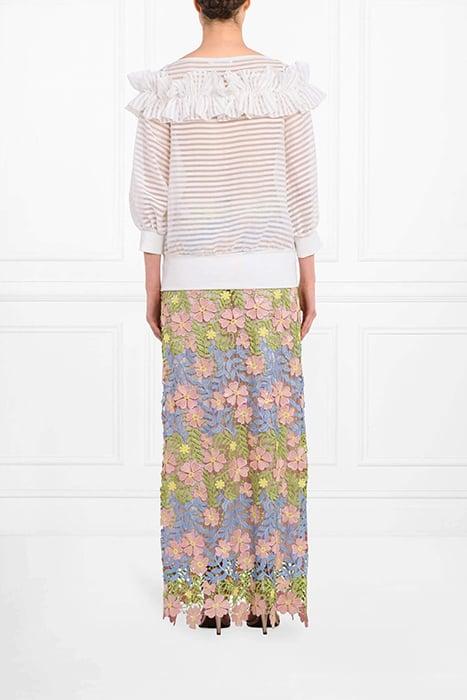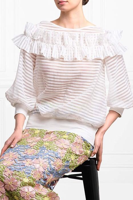 The PIVOINE is a 3/4 sleeve blouse with transparent and opaque stripes enhanced with double ruffles around the shoulders in the front and back. This moon white blouse features slightly voluminous sleeves, a boat neckline and a soft jersey cotton hem and cuffs. The PIVOINE is cut for a slightly loose fit.