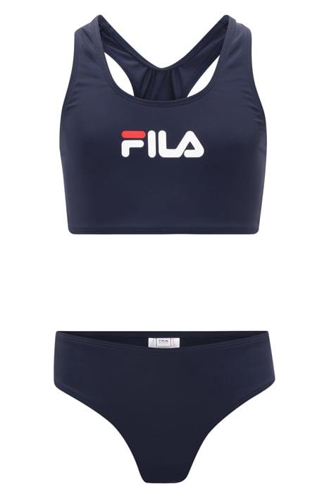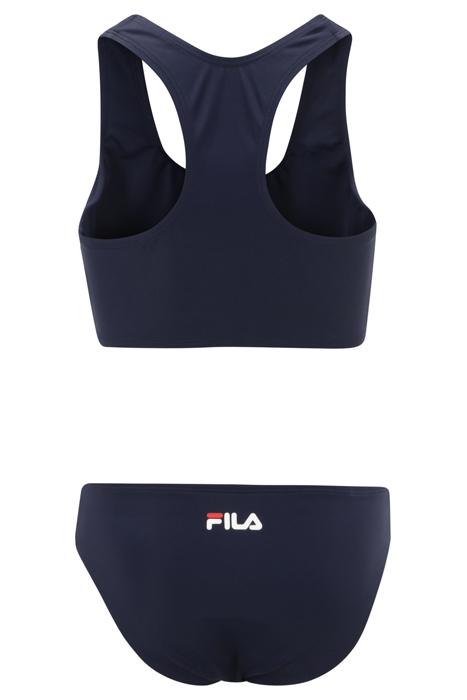 Sporty Bikini Set With A Racer Back For Teen Girls. In A Single Jersey Lycra Quality And Branded With A Large Fila Linear Logo Across Chest. Combined With A Regular Pair Of Bottoms.