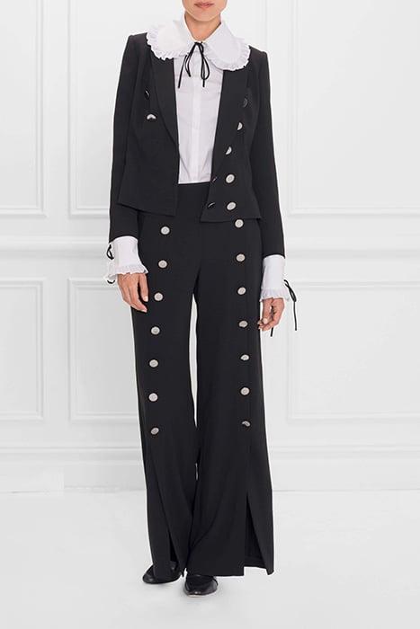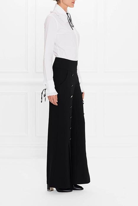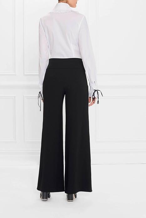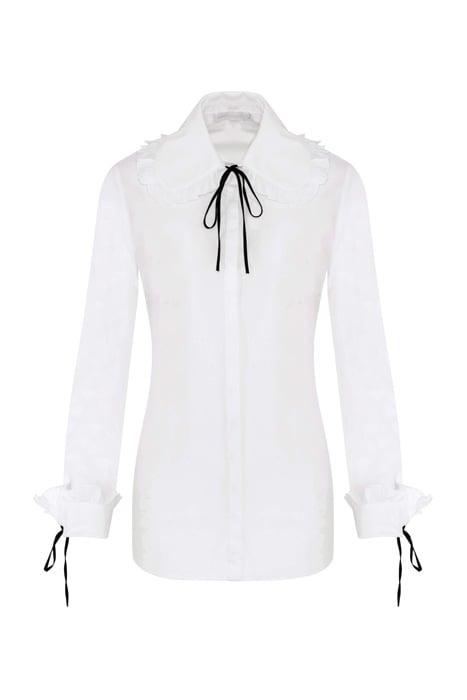 The SHIVA is a long sleeve cotton poplin shirt with contrasting black tie details on the collar and cuffs. This unique style features a removable collar and cuffs adorned with voile ruffles, making of this versatile and playful shirt a great addition to your wardrobe.