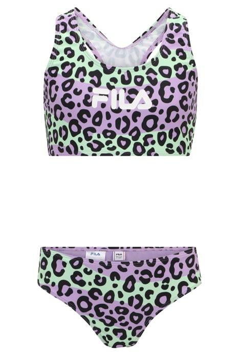 Sporty Bikini Set With A Racer Back For Teen Girls With A Leo Aop. In A Single Jersey Lycra Quality And Branded With A Large Fila Linear Logo Across Chest.