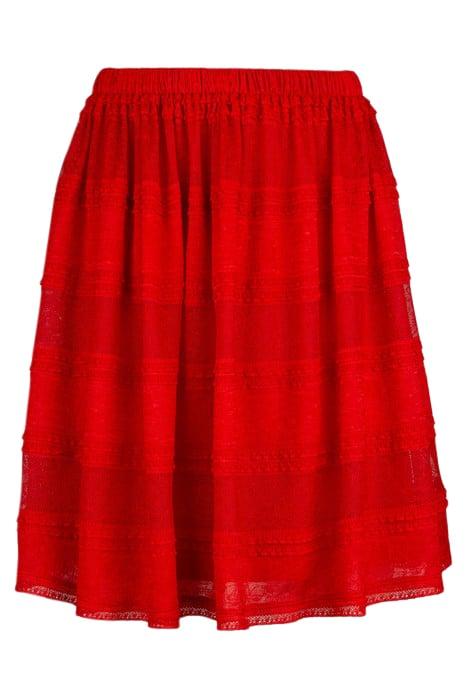 Festive jersey lace skirt with slightly transparent all-over pattern of fine vertical ruffles. The skirt is lined with a soft jersey. The skirt has an elastic waistband and falls above the knee. The model is 1.70m and wears size 36.