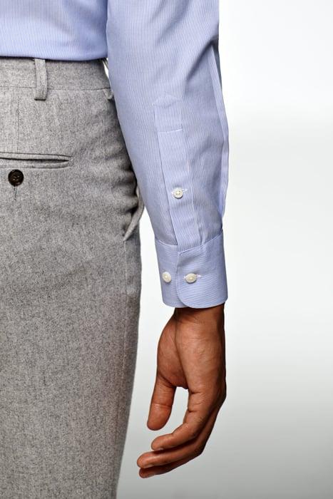 • Tailored to our slim fit, this crisp blue hairline traveller shirt is crafted from wrinkle-resistant cotton and features a single cuff and classic collar.