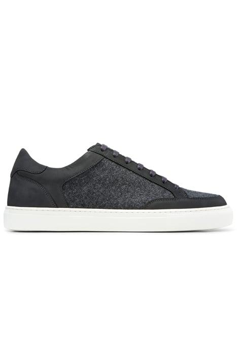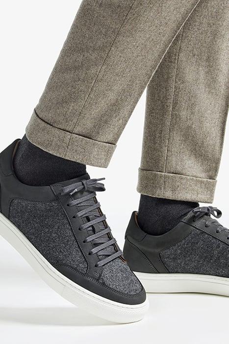 • These smart grey sneakers are made from Italian nubuck combined with wool flannel from the Italian mill Vitale Barberis Canonico. They feature a light brown leather interior, flat waxed laces and a rubber chevron sole.