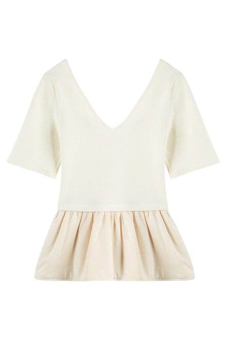 In this contrast top, Struc is combined with a viscose lapel. Because the viscose lap has filling, the fabric gets volume. The top fits snugly with the lap being wider. The open neck and back make the top feminine. Our heritage fabric called 'Struc' has a luxurious structure with an ultimately comfortable wearing experience. It has been a common thread through our collection for years. Struc is a mix of responsibly sourced cotton, polyamide and elastane and comes from Turkey. With functionality in mind, this fabric has been developed in such a way that it remains beautiful for years and is easy to wash. In addition, the Chinese Viscose used in the lap is extremely soft and light on the skin. The model is 1.77 m and wears size 36.