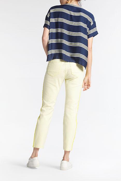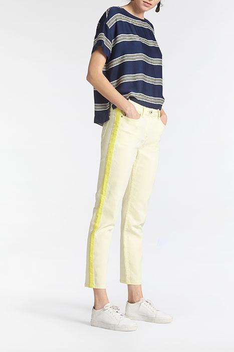 Deze jeans is voorzien van een hoge taille en nauwsluitende pasvorm. Als detaillering heeft deze broek een bies aan de zijkant.