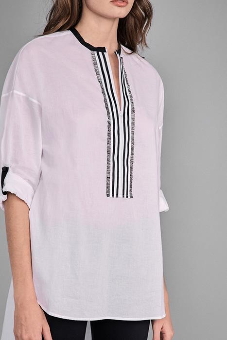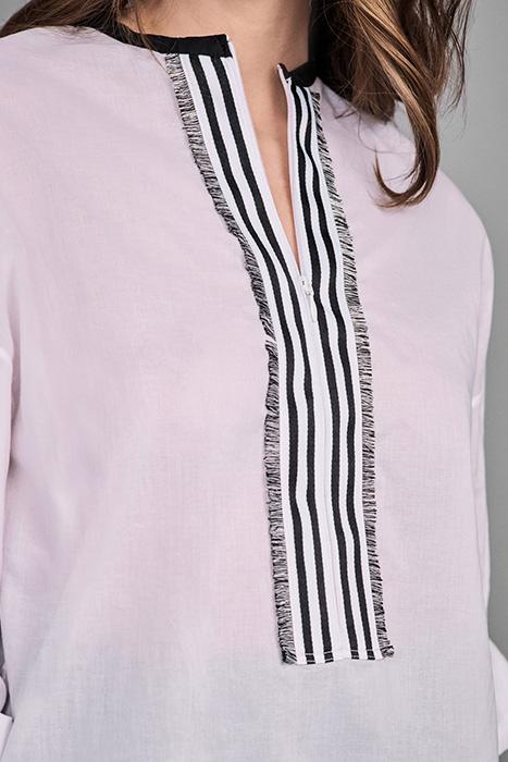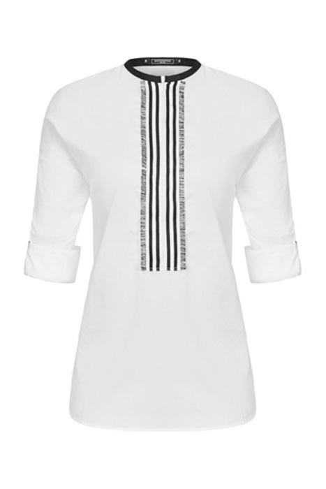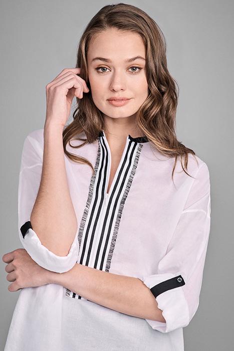 The Venisa Is An Oversized Cotton Voile Blouse With A High-Low Stair Step Hem, A Round Neckline, And A Narrow Banded Collar. This Blouse Features A 3/4 Length Front Zipper That Is Framed With Double Black Vertical Stripes And A Frayed Edge. The Venisa Is Embellished With A Drop Shoulder Style And The Full-Length Sleeves Are Able To Be Rolled Up And Held With A Tab To Create Elbow-Length Sleeves. - White Blouse With Vertical Black Stripes