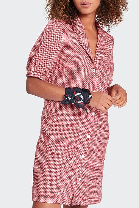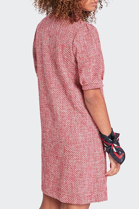 Winter Crimson Straight Dress . Suit Collar, Slightly Puffed Short Sleeves . 2 Patch Front Pockets . Tweed-Look Fabric With Metallic Fibre . Buttons Down Front To Fasten, Ic Signature Button . Length: 86 Cm.