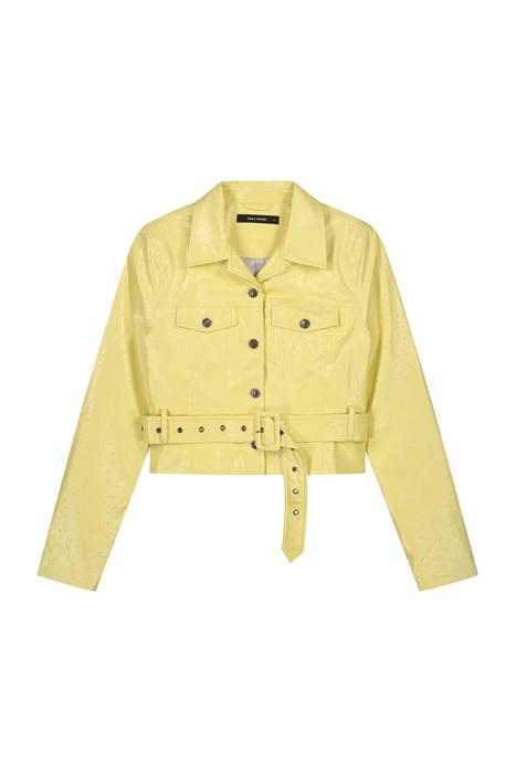 American workwear meets British outerwear and faux exotic leather on this jacket. Mixing the body of a denim trucker jacket and the belted detail of a classic trench coat, this piece takes on a contemporary feel due to its bright yellow polyurethane coated fabric thats been embossed to look like ostrich skin. A monogrammed lining and woven label below the collar are the finishing details.